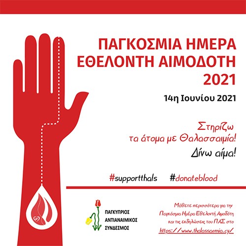 Την εκτίμηση και τις ευχαριστίες ολόκληρης της κοινότητας των ατόμων με Θαλασσαιμία της Κύπρου εκφράζει ο Παγκύπριος Αντιαναιμικός Σύνδεσμος, στις χιλιάδες των αιμοδοτών που μέσα από την εθελοντική προσφορά αίματος δίνουν ελπίδα στους συνανθρώπους τους με Θαλασσαιμία αλλά και σε όλους όσους έχουν ανάγκη και προχωρεί στην έκδοση παιδικού βιβλίου για την αιμοδοσία.